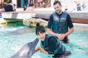 Vợ chồng Hà Anh vui đùa cùng cá heo