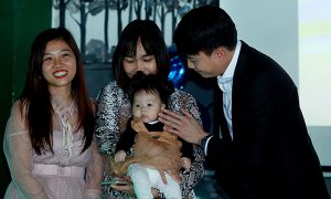 Fan bế con đến gặp Quốc Trường