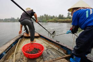 Với chiếc sào tự chế, ngư dân huyện Núi Thành lặn ngụp trên sông bắt
