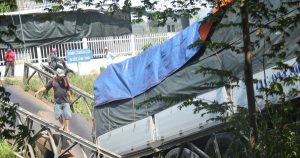 Chiếc xe tải 24 tấn chở dừa khô chạy qua cây cầu sắt có tải