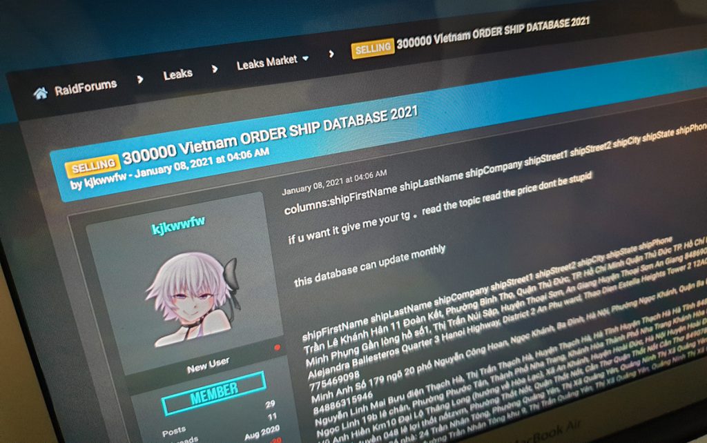 Các dữ liệu được chia sẻ bởi tài khoản có tên “kjkwwfw” trên Raidforum – một diễn đàn chuyên mua bán các dữ liệu đánh cắp. Tài khoản này tham gia diễn đàn từ tháng 8/2020 và đăng bài viết rao bán dữ liệu cá nhân hôm 8/1. Hacker không đăng tải toàn bộ thông tin của 300.000 người mà thông báo, những ai muốn mua đầy đủ dữ liệu cần liên hệ riêng để thương lượng giá. Trong bài viết của mình, hacker này còn nói rằng “dữ liệu sẽ được cập nhật hàng tháng”.