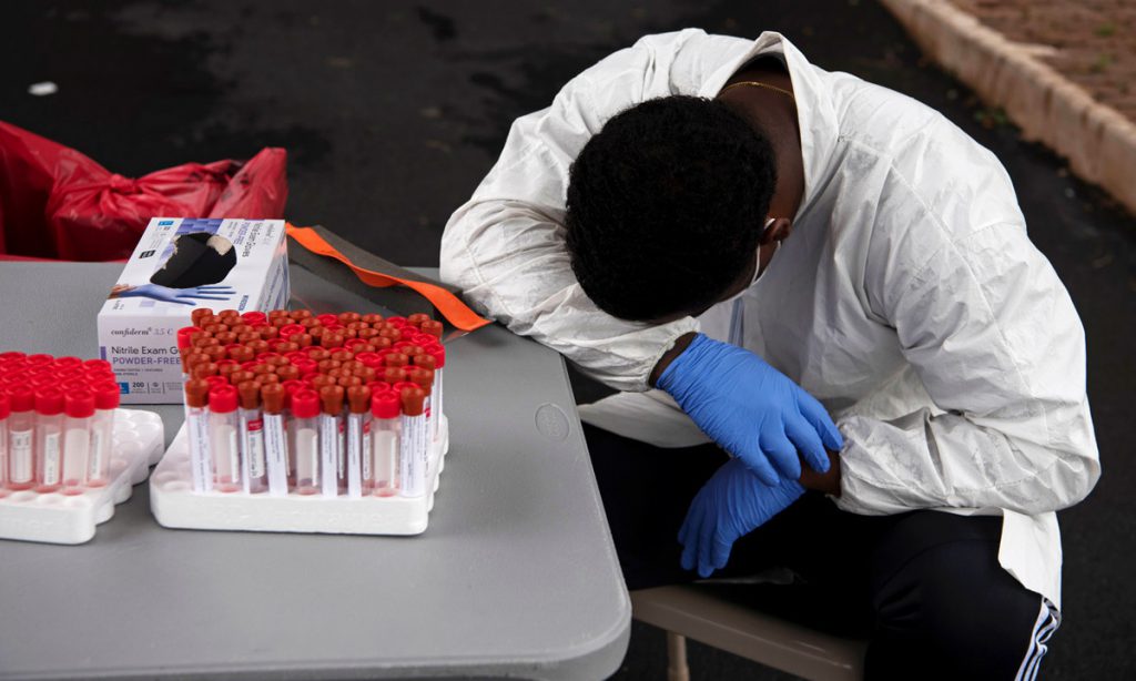 Một nhân viên y tế nghỉ ngơi tại một trạm lấy mẫu xét nghiệm nCoV ở thành phố Houston, bang Texas, Mỹ, hôm 7/7. Ảnh: Reuters.
