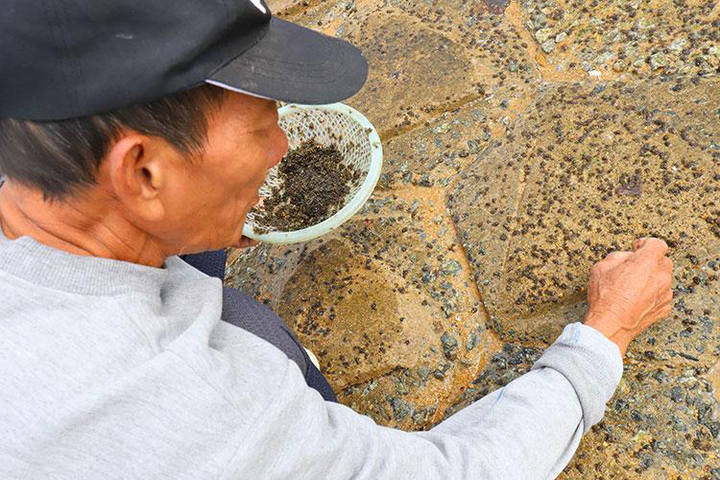 “Rong biển mọc trên các bờ kè, rạn san hô, vách đá và có thể sống ở hai môi trường, nước mặn và nước lợ”, bà Thìn nói. Cứ khoảng 10 phút, bà Thìn đưa nhúm rong vừa nhặt vào chậu nước đặt phía trên bờ.