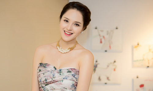 Á hậu Việt Nam 2012 khoe trọn bờ vai nuột nà với một chiếc váy quây in hoa cổ điển. Cô phối bộ váy với giày cao gót trắng cùng các loại trang sức ngọc trai.