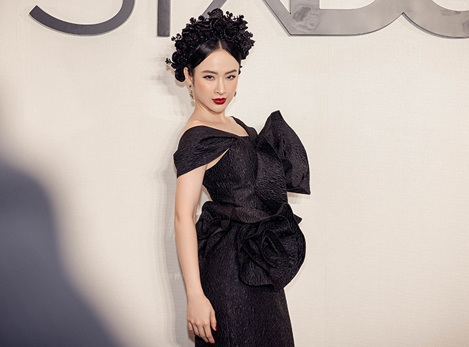 Angela Phương Trinh diện nguyên bộ trang phục đen với phần tạo khối cánh hoa 3D nổi bật. Stylist Hoàng Ku còn chọn thêm bờm cài tóc đồng điệu với bộ cánh.