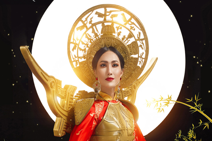 Trang phục do Văn Thành Công thiết kế, nằm trong bộ sưu tập kỷ niệm 20 năm làm nghề của anh. Áo dài gấm có hai lớp, nền vàng, họa tiết trống đồng được thêu bằng chỉ vàng. Thí sinh sẽ mặc áo giáp, đeo biểu tượng chim Lạc sau lưng. Điểm nhấn của trang phục là mấn vàng – phụ kiện từng được người mẫu Thanh Hằng trình diễn năm 2014.