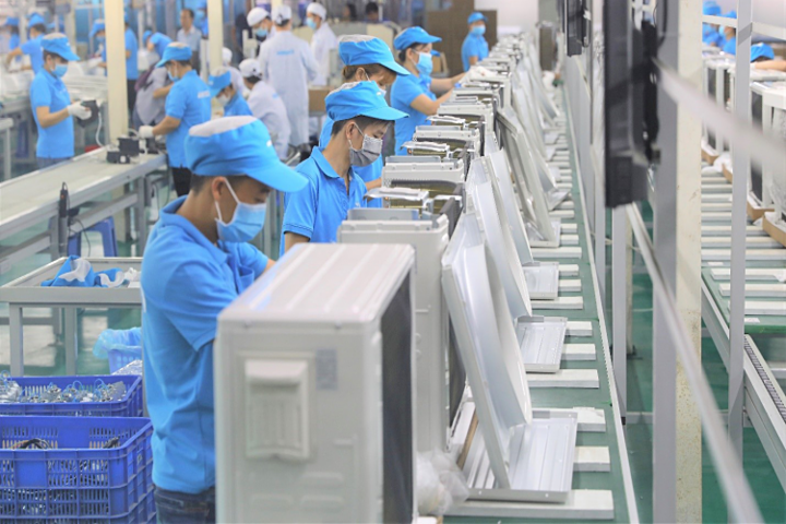 Những ngày cuối tháng 2, nhà máy Asanzo (quận Bình Tân, TP HCM) tập trung toàn bộ nhân lực cho dây chuyền lắp đặt máy điều hòa. Hàng trăm công nhân trong chế độ đeo khẩu trang phòng dịch, chuyên tâm cho nhiệm vụ của mình, thứ âm thanh lấp đầy không gian rộng hàng nghìn m2 của nhà máy đến từ các chuyền máy tự động và những chuyến xe vận chuyển thành phẩm ra kho.