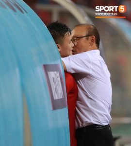 Thấy HLV Park Hang-seo đứng lặng một mình ở cabin sau chiến thắng trước Philippines, Quang Hải chạy tới ôm hôn, chia vui cùng thầy