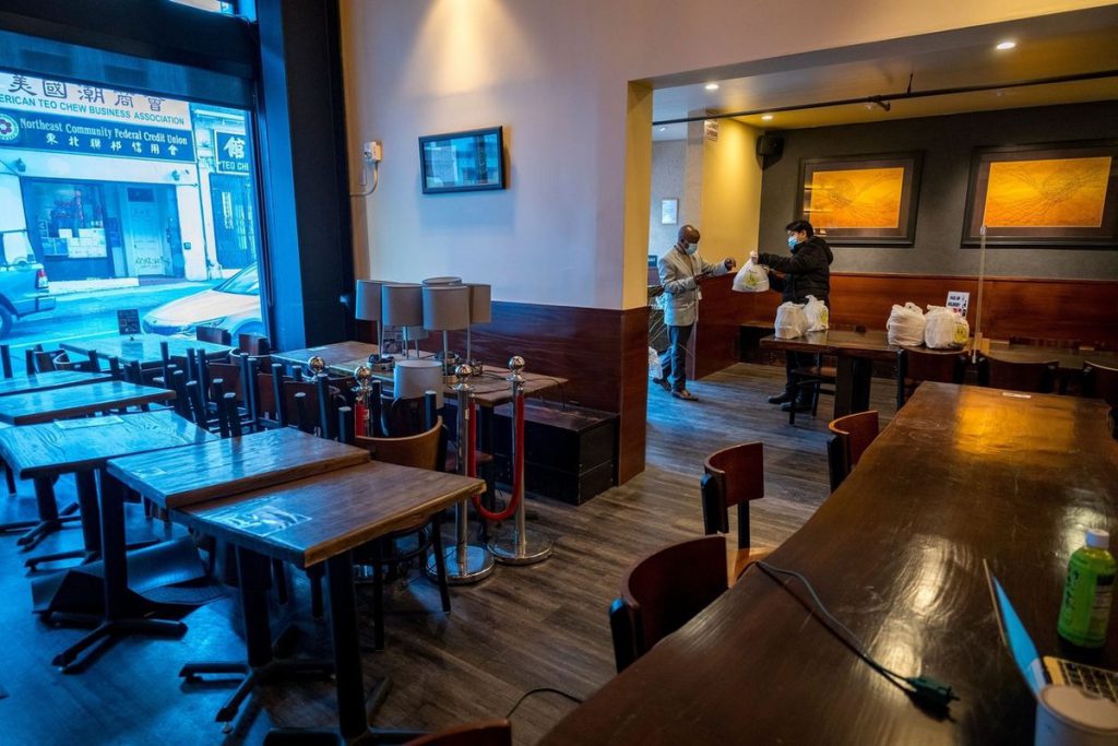 Một khách hàng đeo khẩu trang nhận đồ ăn từ một nhà hàng ở San Francisco vào đầu tháng 12. Ảnh: Bloomberg.