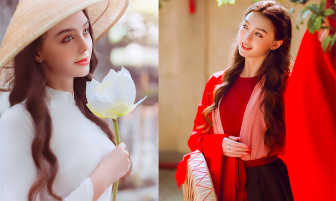 Bức hình đầu tiên, Dianka diện áo dài trắng, đội nón lá và cầm trên tay một bông sen trắng. Chiếc áo ôm sát giúp chân dài người Ukraine tôn vẻ đẹp ngọt ngào, đằm thắm, khác hẳn với phong cách cá tính của cô nàng đến từ châu Âu. Bức hình thứ hai, Dianka dễ thương trong bộ áo tứ thân và mang nón quai thao.