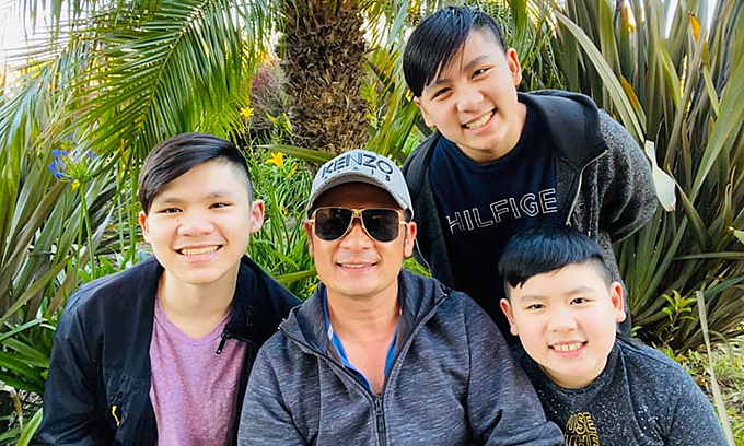 Bằng Kiều và ba cậu con trai ở Mỹ trước khi anh một mình về Việt Nam làm việc.