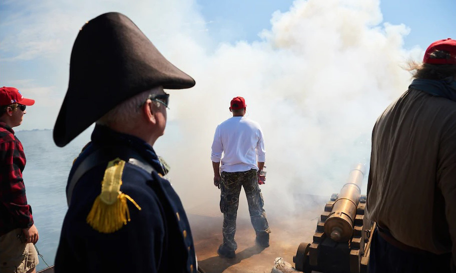 “Vẫn còn thêm người đến tham gia diễu hành! Các bạn có thấy tất cả họ không?”, Shaun Bickley, chủ sở hữu chiếc sà lan, lớn tiếng. Hơn 10 người đàn ông đang bắn đại bác đều đội mũ đỏ thêu tên Donald Trump và lời ca ngợi Tổng thống Mỹ. Trên bờ là đoàn xe máy và xe bán tải, trong khi một phi cơ quân sự đời cũ bay phía trên.