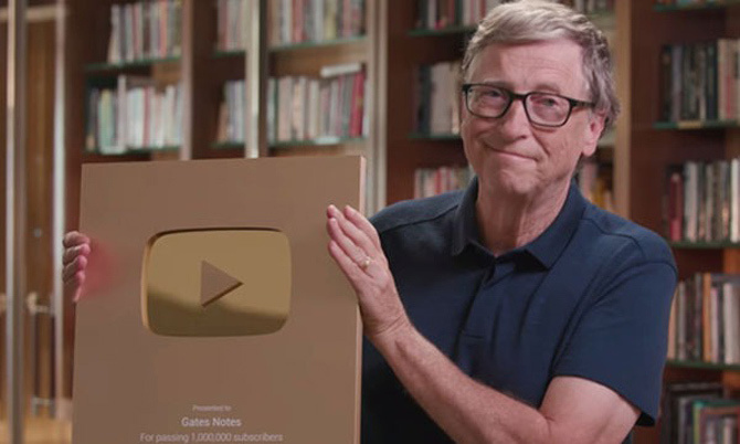 Bill Gates và vợ, bà Melinda, thành lập kênh YouTube có tên Bill Gates vào năm 2012 để đăng tải các video ngắn chia sẻ câu chuyện truyền cảm hứng. Sau 7 năm hoạt động, kênh YouTube của vợ chồng tỷ phú Bill Gates nhận được nút vàng khi cán mốc 1 triệu lượt người đăng ký. Video “đập hộp” nút vàng của Bill với tựa đề “Cảm ơn một triệu người đăng ký của chúng tôi” hôm 25/10 chỉ 27 giây nhưng có hơn 2 triệu lượt xem chỉ sau 5 ngày.