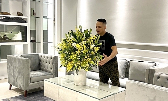 Nhà phố 4 tầng ngay trung tâm thành phố biển được Cao Thái Sơn khởi công cải tạo từ sau Tết nhưng vì dịch Covid-19 nên tiến độ bị chậm lại. Mới đây, anh vừa hoàn thiện những bước cuối trước khi dọn về ở. Nam ca sĩ tự tay lau dọn, cúng nhập trạch và cắm nhiều hoa tươi để hương thơm tự nhiên át bớt mùi sơn mới.