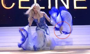 Người đẹp Celine Van Ouytsel vấp ngã trong khi trình diễn trang phục dạ hội