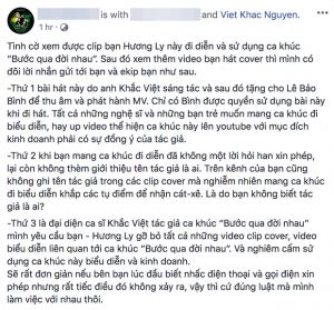 Tin Nóng: Đại diện nhạc sĩ Khắc Việt tố Hương Ly quay clip cover và đi diễn “Bước Qua Đời Nhau” chưa xin phép; yêu cầu gỡ bỏ video.