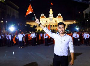 Nguyên Khang rước cờ cùng sinh viên mừng ngày Quốc khánh