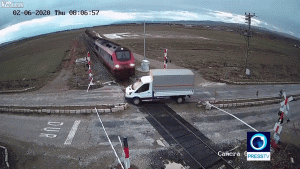 Chiếc van húc thanh chắn định vượt qua đường sắt nhưng mắc kẹt, đúng lúc