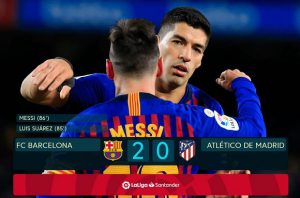 Bàn thắng: Suarez (85′), Messi (86′) Thẻ đỏ: Costa (Atletico, 28′) Messi và Suarez cùng