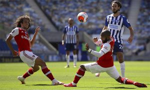 Tiền vệ Arsenal Matteo Guendouzi bóp cổ Neal Maupay, vào cuối trận thua ngược Brighton ở vòng
