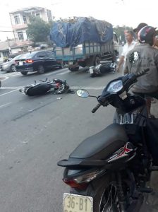 Bình Dương: Xe máy dừng đèn đỏ bi xe tải đâm