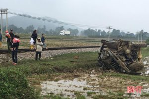 Hà Tĩnh: Xe tải băng qua đường sắt, bị tàu hỏa đâm bay xuống ruộng