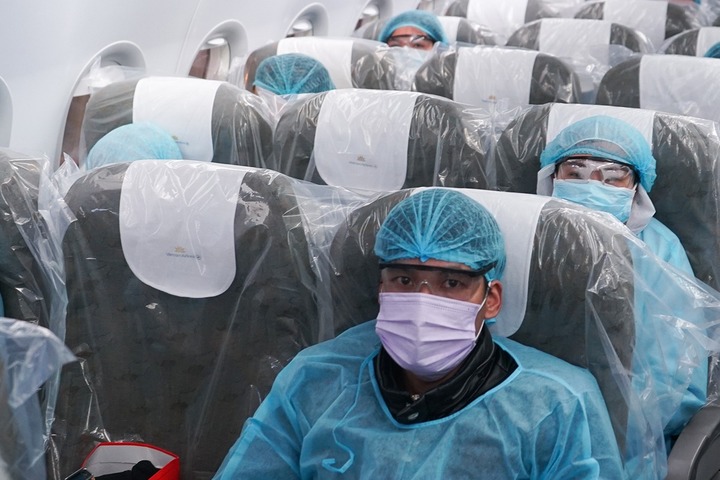 Toàn bộ ghế được bọc nylon, đội bay mặc hai lớp bảo hộ. 30 công dân Việt Nam được kiểm tra sức khỏe trước và trong chuyến bay.