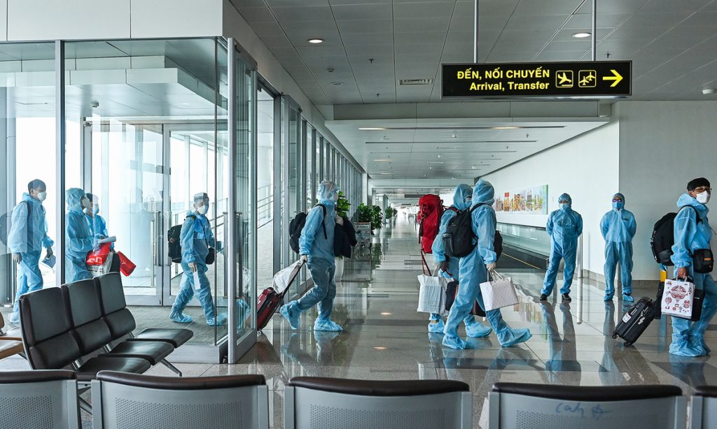 Lực lượng an ninh sân bay mặc đồ bảo hộ để làm thủ tục cho hành khách nhập cảnh.
