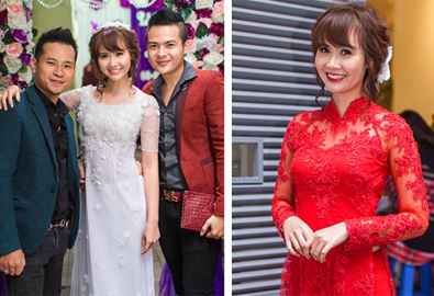 Chiếc áo dài ren đỏ nổi bật là trang phục được Huyền Lizzie lựa chọn lúc thực hiện các nghi lễ trang trọng. Để phù hợp với trang phục, màu son và kiểu tóc cũng được thay đổi đồng điệu. Trong khi son môi được đổi sang màu đỏ tươi thì kiểu tóc cũng được chuyên gia tiết chế bớt sự cầu kỳ, cài hoa lan trắng phía sau thay cho băng đô.
