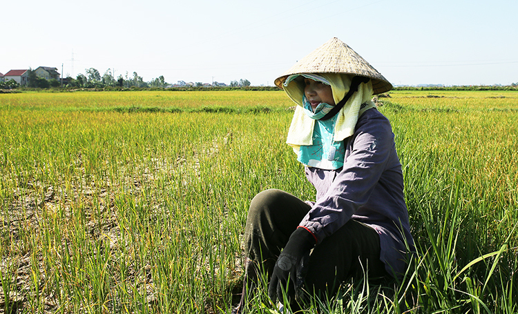 Chị kể, gần hai tháng trước, chị thuê máy đập, mua giống, phân, thuốc cỏ… để gieo cấy gần 6 sào ruộng. Chi phí mỗi sào (loại 500 m2) tốn hơn nửa triệu đồng. Khi lúa được 10 ngày tuổi thì một cơn mưa giông trút xuống, rồi sau đó là 30 ngày trời nắng chang chang.
