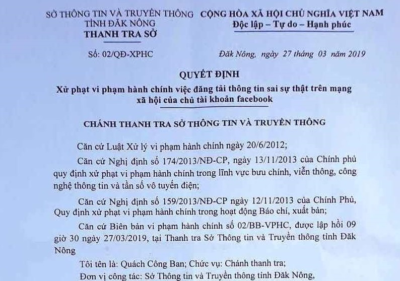 Ngày 27/3, nguồn tin từ Sở Thông tin và Truyền thông Đắk Nông cho biết, Chánh Thanh tra Sở, ông Quách Công Ban, đã ký Quyết định xử phạt hành chính số 02/QĐ-XPHC về xử phạt vi phạm hành chính việc đăng tải thông tin sai sự thật trên mạng xã hội facebook.
