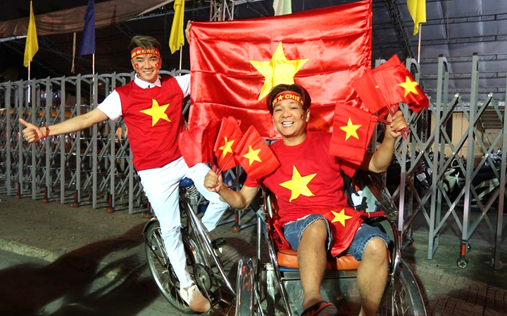 Đàm Vĩnh Hưng và Vũ Hà mặc áo cờ đỏ sao vàng, mang nhiều cờ Tổ quốc, chạy dọc các con phố, hòa vào đám đông mừng chiến thắng của U22 Việt Nam.