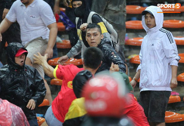 Tuy nhiên, điểm nhấn của trận đấu không chỉ tới từ màn trình diễn của các cầu thủ mà còn nằm ở trên khán đài. Sự cố xảy ra khi rất nhiều cổ động viên Malaysia đã tràn qua khán đài để đánh cổ động viên Việt Nam. Xích mích giữa 2 nhóm cổ động viên xảy ra ngay từ thời điểm cuối hiệp 2 khi nhiều người hâm mộ Việt Nam yêu cầu trọng tài rút thẻ đỏ sau tình huống vào bóng ác ý của cầu thủ Malaysia với tiền vệ Hoàng Thịnh. Ban đầu cổ động viên chủ nhà chỉ ném chai lọ rồi sau đó bùng nổ thành một cảnh tượng kinh hoàng. Ảnh: Tùng Lê