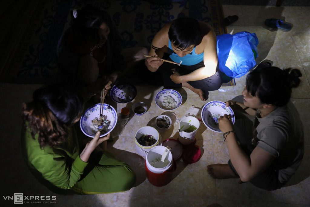 Lúc 20h, khu sơ tán mất điện tạm thời, gia đình ông Nguyễn Văn Tiến ăn tối dưới ánh đèn pin. Trước giờ di tản, cả nhà chỉ kịp nấu bữa cơm chiều và dọn chút quần áo, chăn mền, nước uống rời khỏi nhà, cách nơi di tản khoảng 3 km.