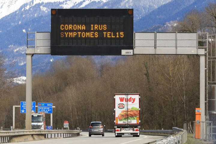 Một thông báo ngày 28/2 trên đường cao tốc A43 ở Pháp có nội dung: Nếu có triệu chứng nhiễm nCoV, hãy gọi 15. Ảnh: Zuma Press.