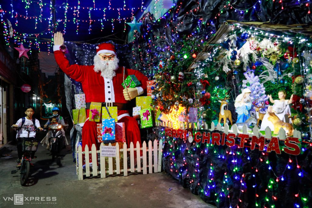 Các con hẻm ở xóm đạo quận 8, Tân Bình, Gò Vấp… tràn ngập không khí Giáng sinh bởi các hình ảnh hang đá, ngôi sao, đèn trang trí, ông già Noel được bày trí khắp nơi.