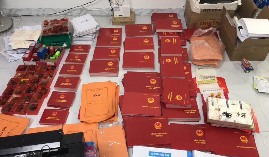 Khám xét nhà 3 nghi can tại quận 12 và Gò Vấp, cơ quan điều tra thu giữ lượng lớn máy tính, máy in, mẫu thiết kế phôi giấy tờ giả, máy làm con dấu; 3.600 phôi bằng đại học, cao đẳng, trung cấp, bảng điểm… trong đó có nhiều bằng hành nghề y, giáo viên đã được in hoàn chỉnh chuẩn bị giao cho khách.