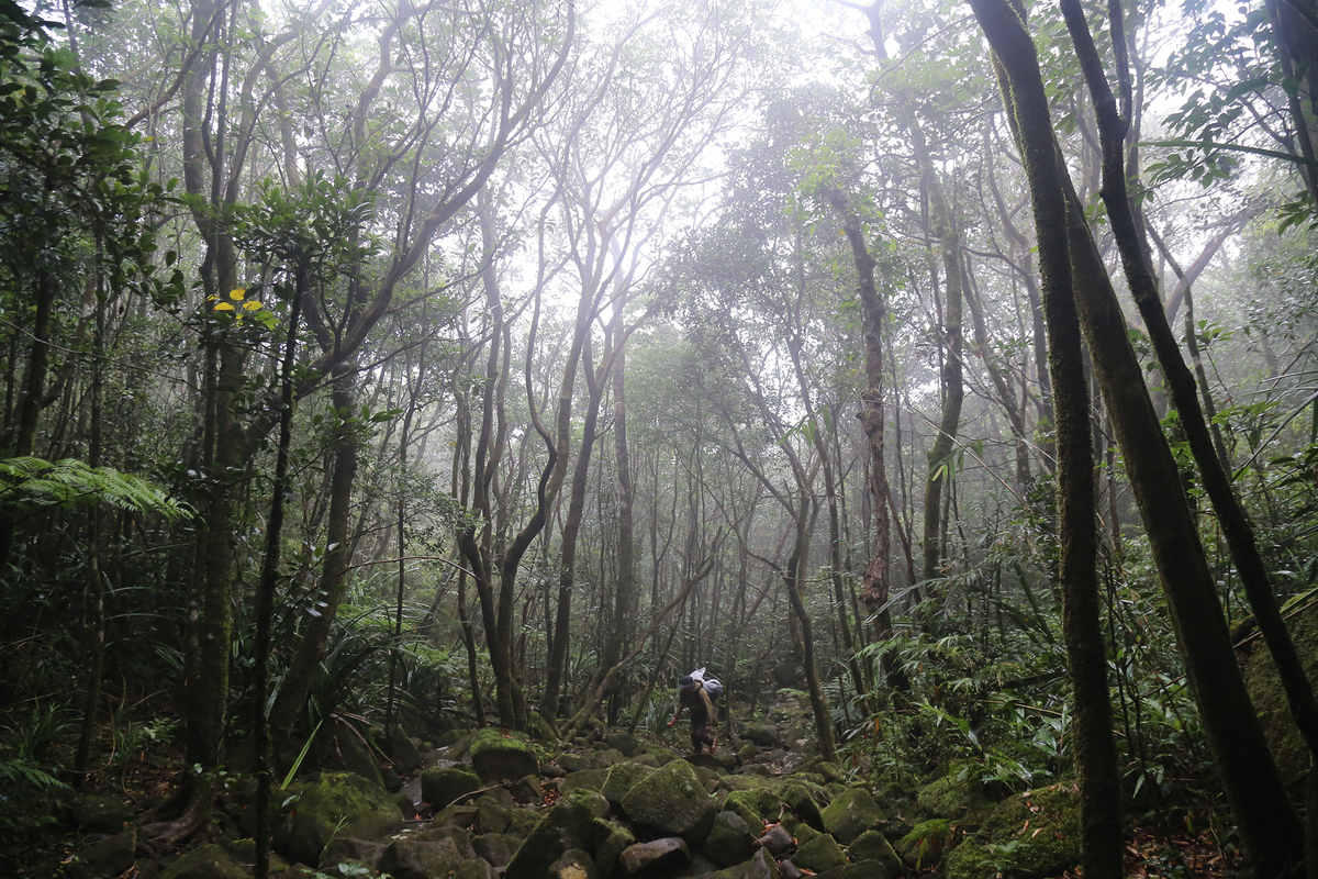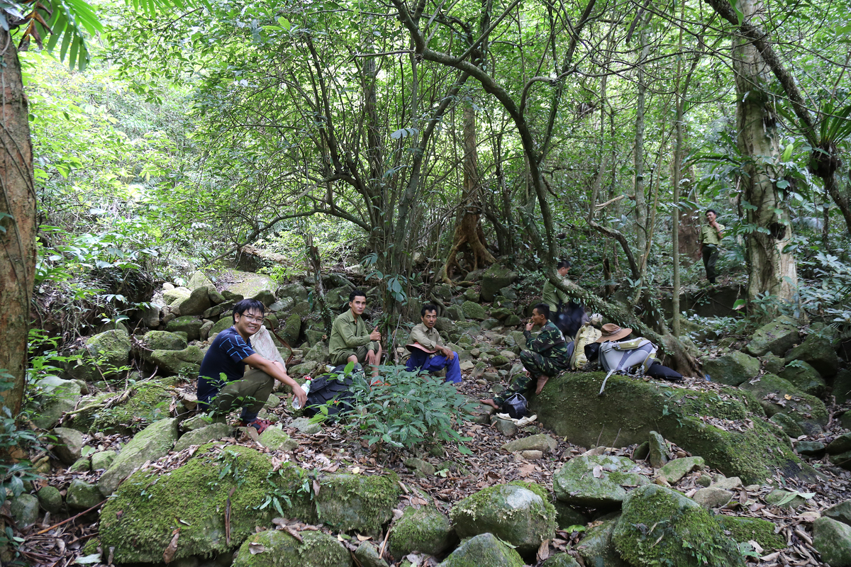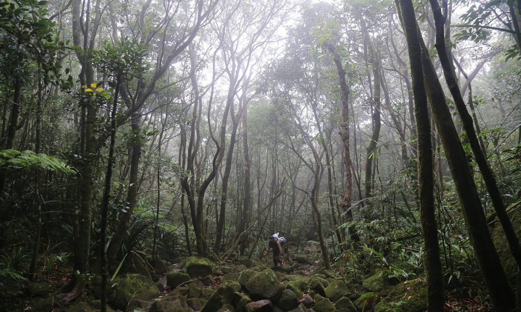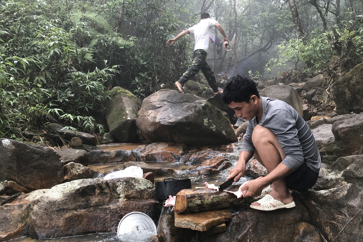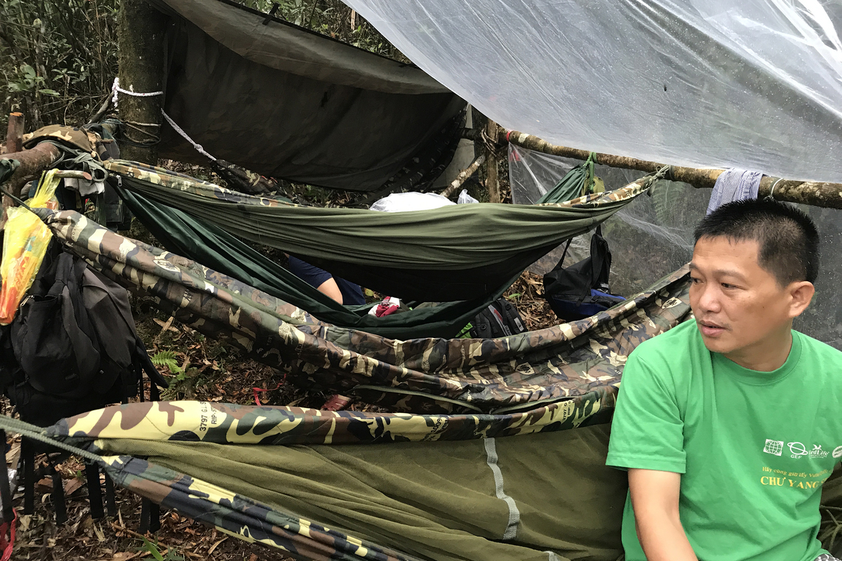 Hoang vu và hiểm trở, mỗi người phải tự mang theo võng và túi ngủ để qua đêm trong cái lạnh ở đỉnh núi cao. Phía trên, các cây rừng được tận dụng để căng ni lông chống mưa.