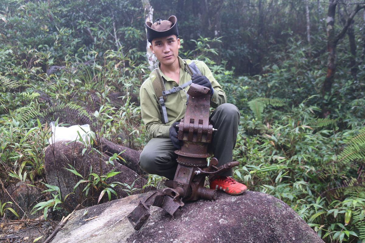 Anh Hồ Văn Hai, một thành viên trong đoàn, đang cầm một chi tiết bằng sắt còn sót lại từ hiện trường chiếc máy bay rơi. Sau hàng chục năm, người dân địa phương đã lấy đi những thứ giá trị để bán phế liệu, chỉ còn lại sắt vụn nằm rải rác trong các bụi trúc và chè.