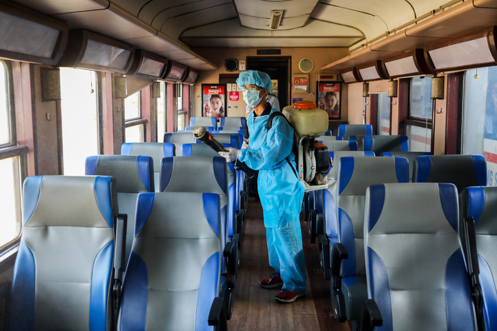 Ngoài đo thân nhiệt khách, nhà ga còn khử trùng từng toa, ghế ngồi, chăn nệm… trên tàu để phòng dịch nCoV.