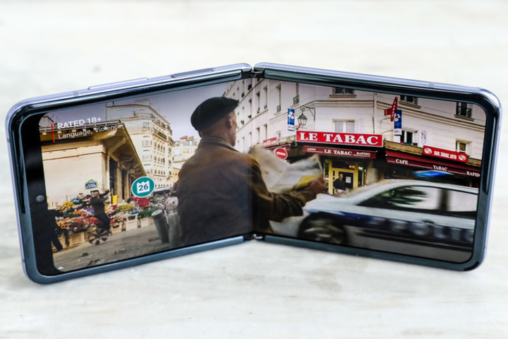 Galaxy Z Flip là thế hệ smartphone màn hình gập thứ hai của Samsung sau Galaxy Fold. Tuy nhiên, thay vì gập dọc như “đàn anh”, máy có thiết kế vỏ sò, màn hình Infinity O kích thước 6,7 inch, tấm nền Super Amoled độ phân giải FullHD+ và tỷ lệ hiển thị 22:9. Bản lề của máy có thể khóa ở góc 70, 90 và 110 độ để thuận tiện cho việc xem các nội dung và trò chuyện video call.