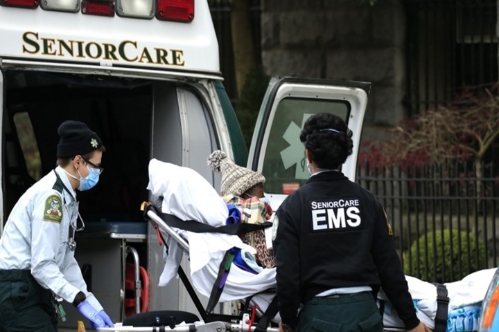 Nhân viên cấp cứu đưa một bệnh nhân khỏi xe cứu thương tại Trung tâm y tế Cobble Hill ở quận Brooklyn, thành phố New York hôm 18/4. Ảnh: AFP.