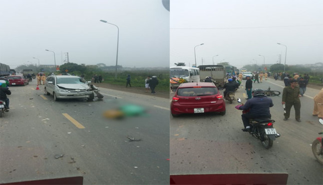 Cú va chạm mạnh khiến 2 người ngồi trên xe máy ngã xuống đường, chết tại chỗ. Tại hiện trường, ô tô và xe máy hư hỏng nặng, nhiều mảnh vỡ vương vãi khắp quốc lộ.