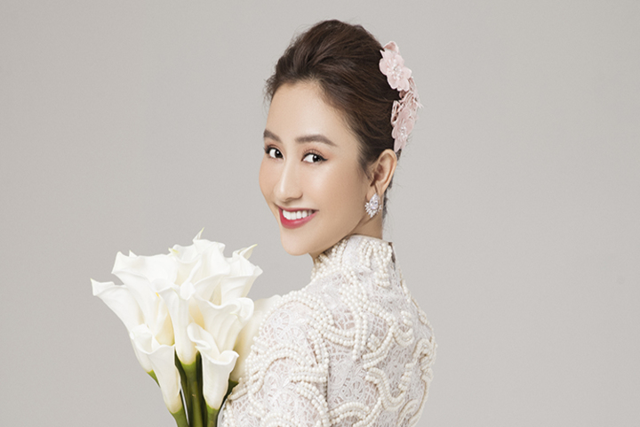 Cô mặc bộ sưu tập Tết 2020 của Minh Châu. Nhà thiết kế cho biết Tết này, anh trở lại với áo dài truyền thống. Họa tiết hoa to bản được đính kết dạng nổi với thông điệp “cánh hoa tình xuân”.