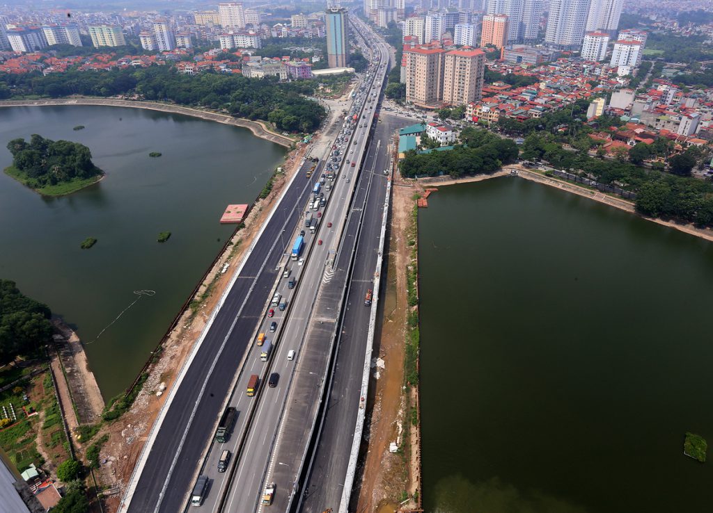 Ngày 25/9, hai cầu vượt qua hồ Linh Đàm (Hoàng Mai, Hà Nội) đã hoàn thiện việc thảm nhựa, trên mặt cầu một số nhóm công nhân lắp đặt hoàn thiện khe co giãn, rãnh thoát nước.