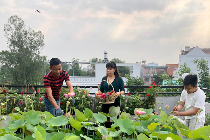Sân thượng của ngôi nhà 300 m2 ở quận 12 được gia chủ bố trí phòng tập gym, bếp, vườn rau xanh và cả một hồ sen nở quanh năm. – Star.vn Đời sống