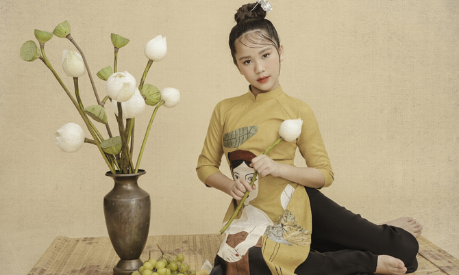 Cô bé trông nhí nhảnh với mái tóc búi hai bên và diện áo dài tay lỡ. Bella Vũ sinh năm 2008. Bé được biết đến từ khi đoạt giải thưởng ‘Công chúa Tài năng’ tại cuộc thi Prince and Princess International 2018 tổ chức tại Thái Lan. Năm 2019, Bella Vũ thi Hoa hậu Hoàn vũ nhí thế giới (Little Miss Universe) tại Georgia và giành giải ‘Hoa hậu nhí thanh lịch’. Bộ ảnh do chuyên gia trang điểm và làm tóc Lâm Nguyễn, Ruan Đặng, stylist Hiền Nguyễn và Trang Phạm lên ý tưởng thực hiện.