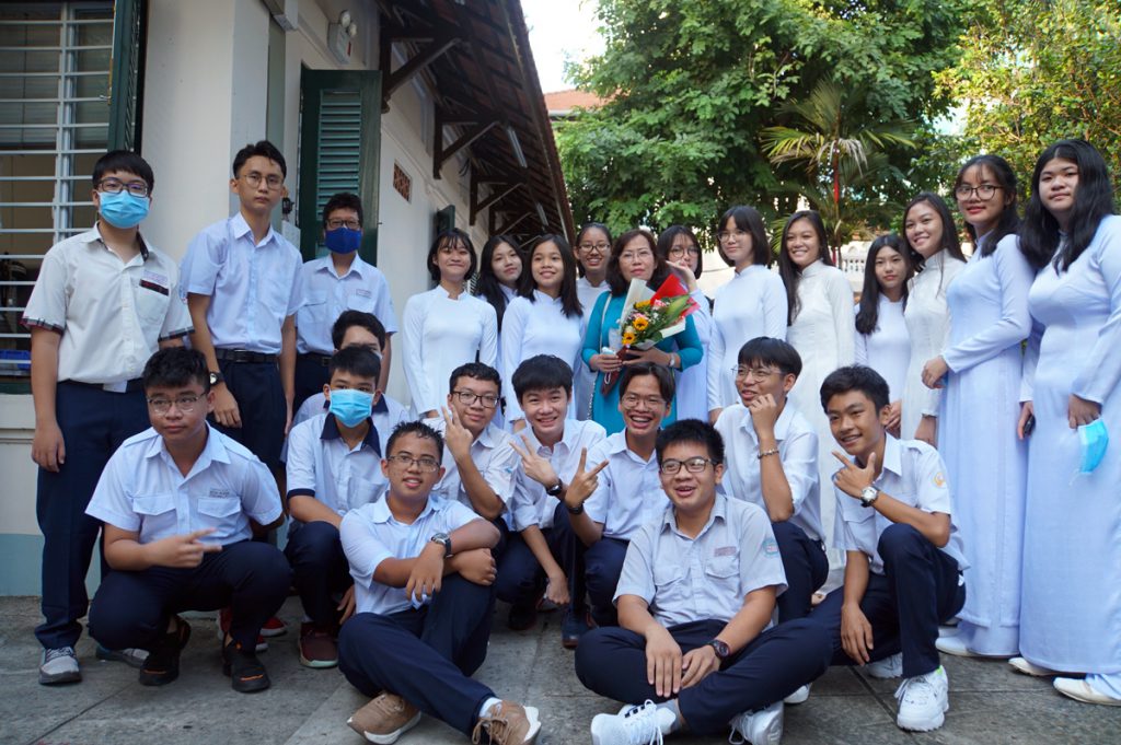 Học sinh một số lớp tranh thủ chụp ảnh lưu niệm đầu năm. Lê Hoàng Minh (lớp 10A4) cho biết đã chuẩn bị cho lễ khai giảng từ chiều qua, sáng nay tự đi xe máy đến trường, tâm trạng vừa vui, vừa hồi hộp. Học lớp 9 tại một trường THCS ở quận 7 trong bối cảnh Covid-19, Minh cùng nhiều bạn phải học trực tuyến nhiều tháng, nhưng nỗ lực để đạt thành tích tốt, vào ngôi trường THPT top đầu.