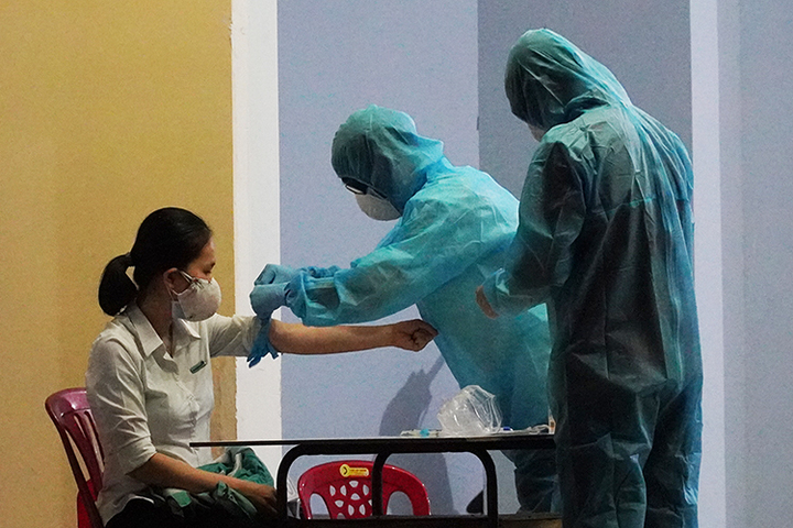 Nhân viên y tế Bình Thuận lấy mẫu máu xét nghiệm những người tiếp xúc với 4 ca nhiễm nCoV tại Phan Thiết, tối 11/3. Ảnh: Việt Quốc.
