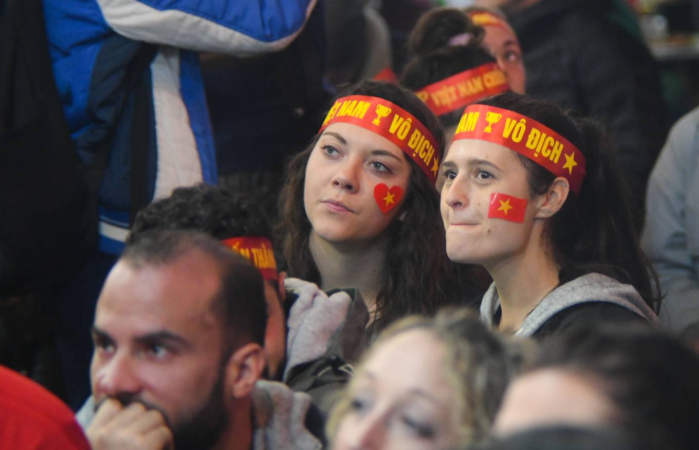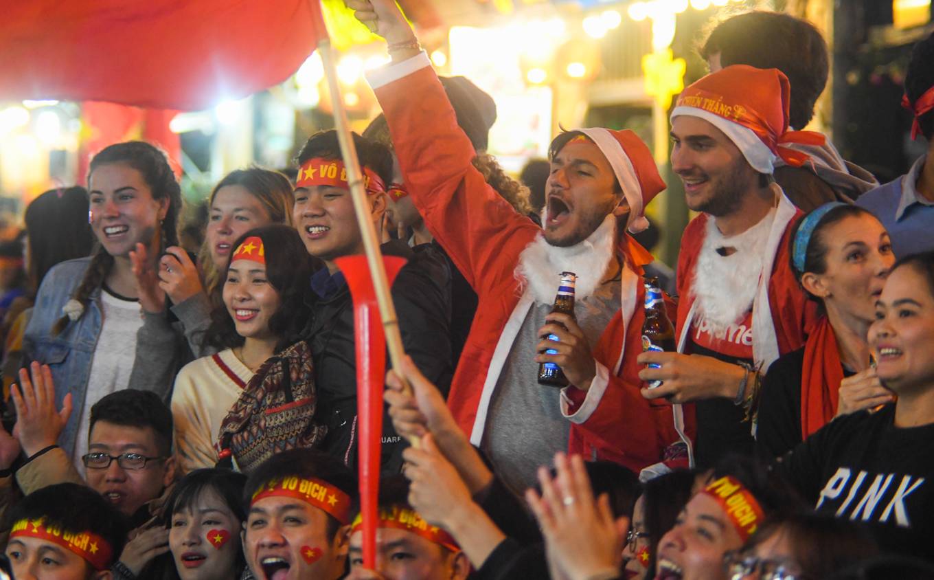 Khu phố đi bộ Tạ Hiện (Hà Nội) thu hút đông du khách tập trung để xem trận chung kết lượt về AFF Cup vào 19h30 tối 15/12. Hai chàng trai nước ngoài trong trang phục ông già Noel reo hò khi các cầu thủ Việt Nam chuẩn bị bước vào thi đấu.